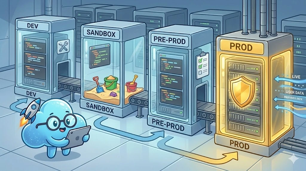 Vous devez structurer votre architecture avec des environnements distincts répondant à des objectifs précis. La hantise absolue d'un DSI de grande entreprise est de vous voir effectuer des tests en production. Cela témoigne d'un manque de maturité dangereux (le fameux "Testing in Prod").